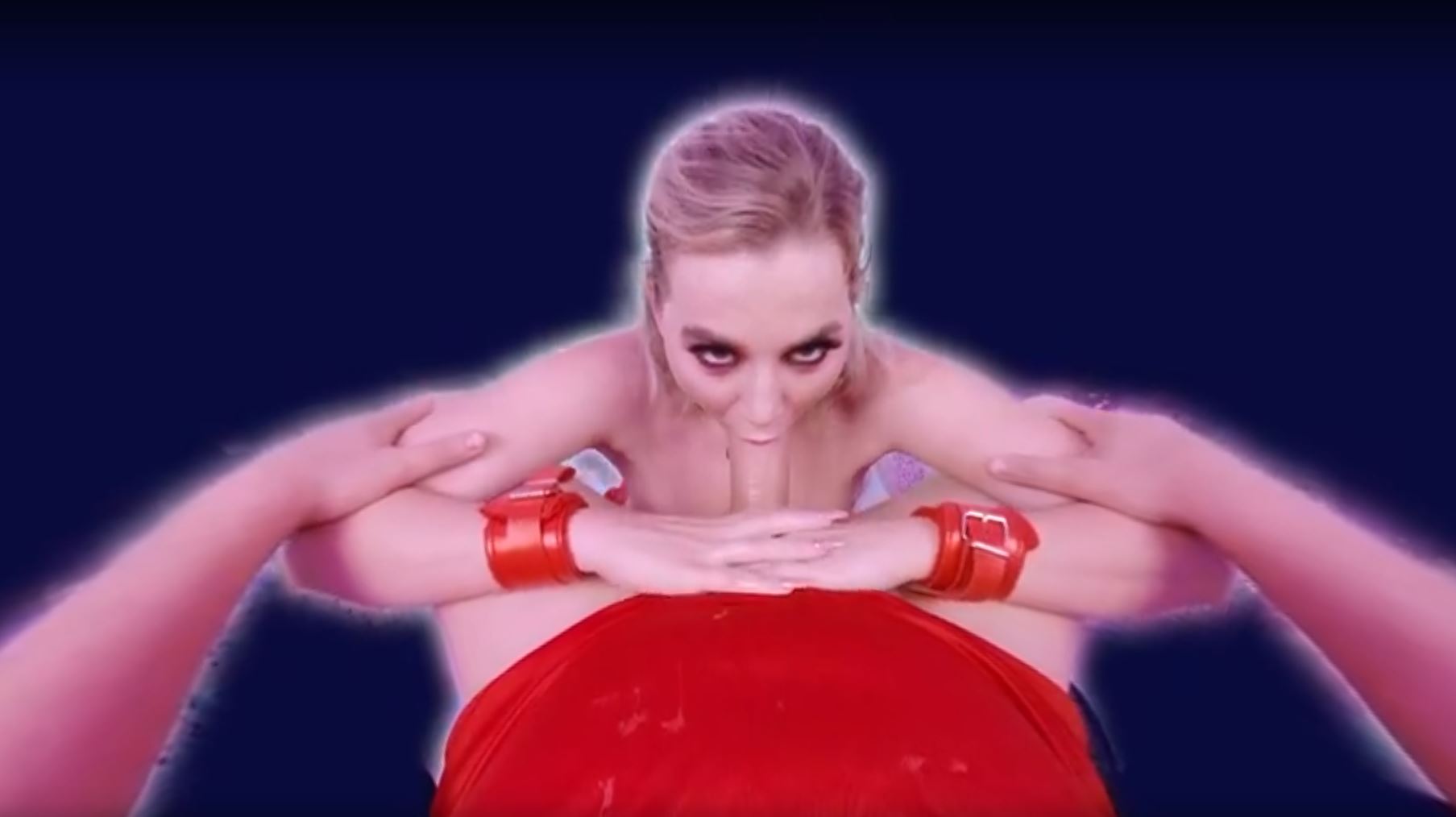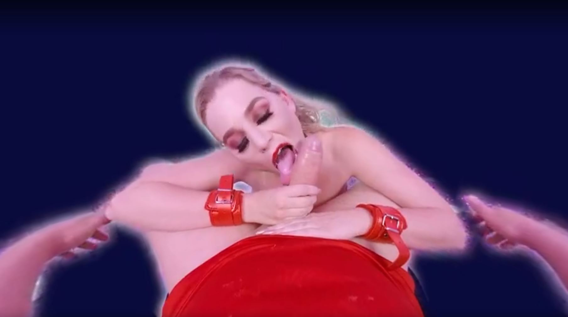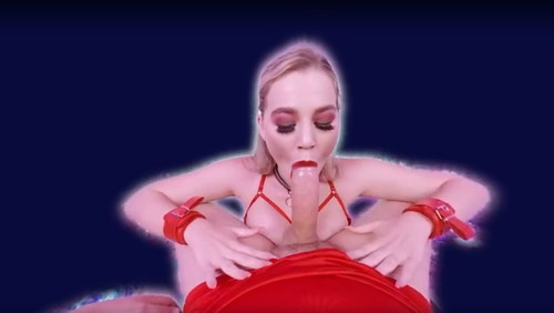 Kneeling before you in her strappy red lingerie, Blake Blossom’s blonde locks cascade over her shoulders as her red lips wrap around a heart-shaped lollipop. She sucks and licks it teasingly, her big natural tits spilling out, fully exposed and heaving with each moan that escapes her throat. The choker around her neck accentuates her sultry gaze locked on yours in this intimate POV view. She brings her ample breasts inches from your face, letting you admire their soft, jiggling perfection up close while her tongue swirls around the candy, mimicking the pleasures to come.