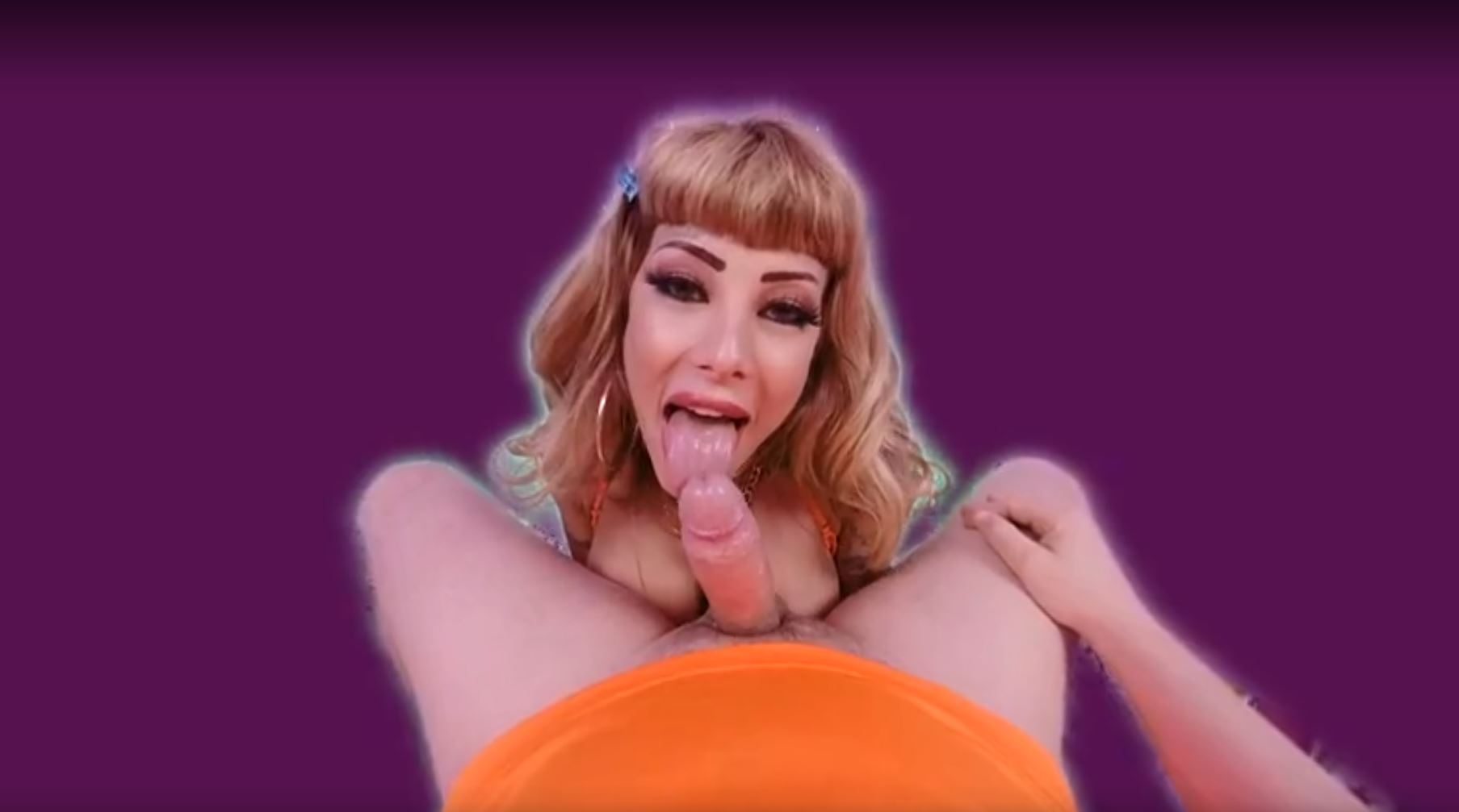 Flipping onto her back, Kitana parts her legs wide, exposing her shaved pussy. She drags a colorful swirly lollipop along her slick folds, licking it teasingly before sucking your thick cock deep into her mouth. The blowjob turns wet and sloppy as she spits generously on your balls, slurping noisily while her hand pumps your shaft vigorously. Her tongue swirls around the head, saliva dripping everywhere, building to an explosive finish where you unload hot cum straight into her eager mouth, swallowing every drop. Immerse yourself in this AR scene in stunning 8K quality.