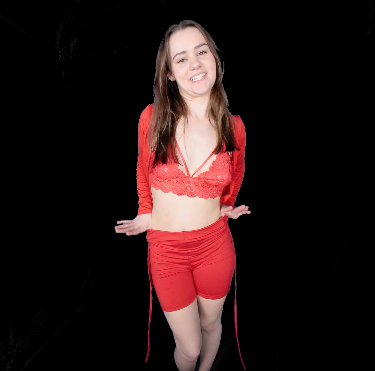 n the dim glow of your room, your grounded stepsister Trinity Olsen slinks in wearing a skimpy red outfit that hugs her petite, pale frame like a second skin. She’s desperate to sneak out for that forbidden concert, and with you in charge for the weekend, she knows exactly how to sway your decision. Her eyes lock onto yours as she crawls onto the bed where you’re laying, her small hands tracing teasing patterns over her body. Whispering promises of secrecy, she slowly peels off her clothes, revealing her smooth, tattooed skin and perky tits, her fingers dipping between her thighs to stroke her wet pussy in a bold display of temptation.