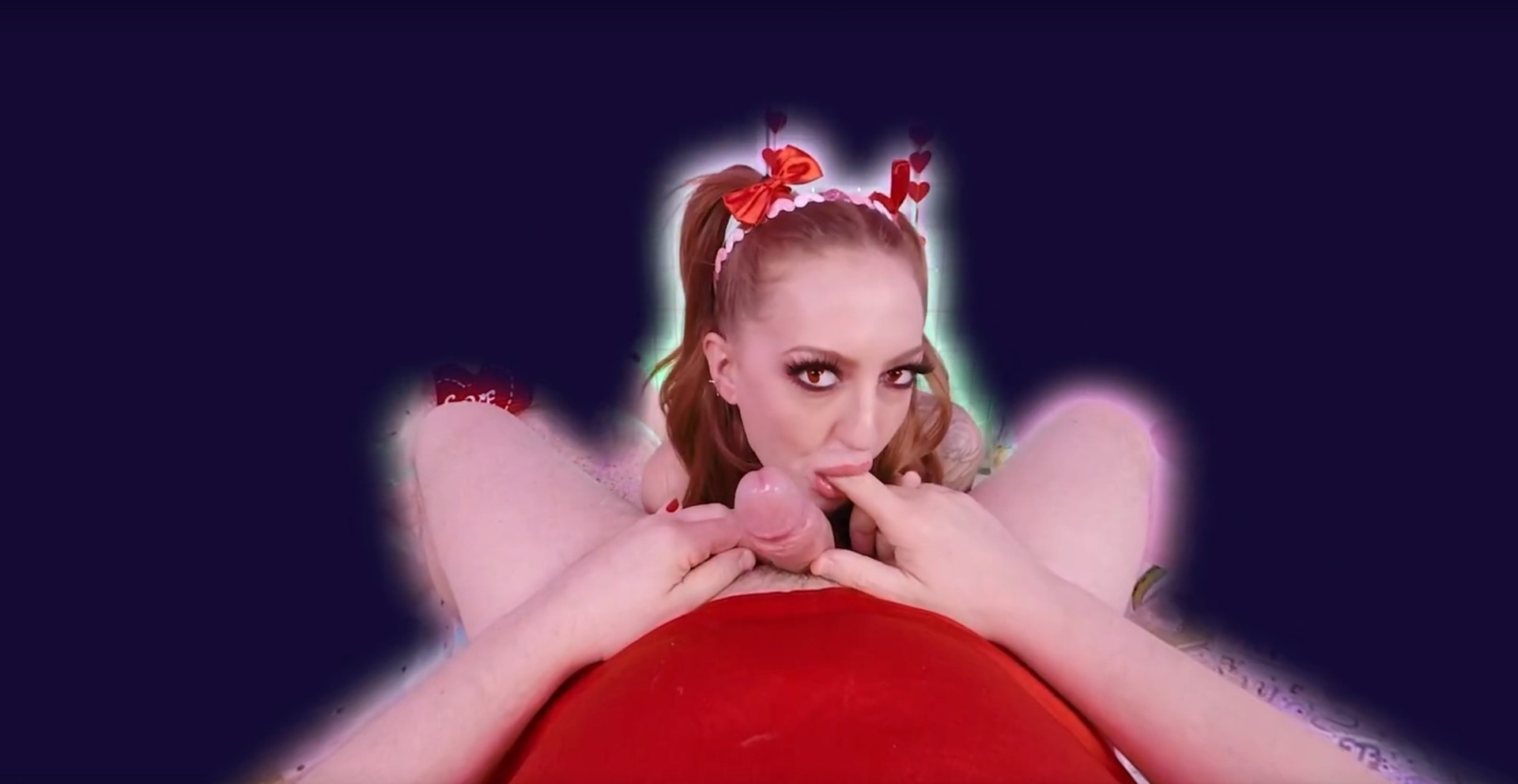 In this sexy AR fantasy, you’re gazing down at Kendra Cole, the skinny redhead pornstar with playful pigtails, her red lips glossy and inviting. Kneeling before you in her skimpy red bra and panties, accented by white fishnet stockings dotted with red hearts, she teases a long red-and-white lollipop with her tongue. She licks it slowly, swirling around the tip, then giggles mischievously, murmuring, “I don’t know, it’s pretty stiff.” With a slutty grin, she shoves it deep into her throat, gagging softly as saliva drips down her chin. Her small tits strain against the lace as she spits on the candy and sucks harder, her eyes locking onto yours with playful hunger.